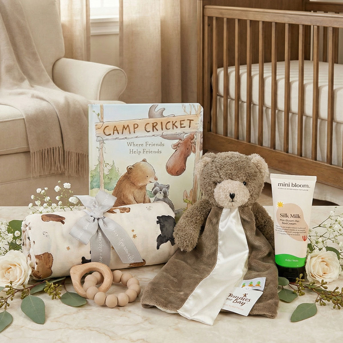 Inside, baby is welcomed with a plush brown bear lovey, an ultra-soft bear-print swaddle, a soothing silicone teether, and a gentle plant-based baby cream to nourish delicate skin. To make the moment extra special, we’ve included a Sugarfina gummy treat for parents to enjoy.
